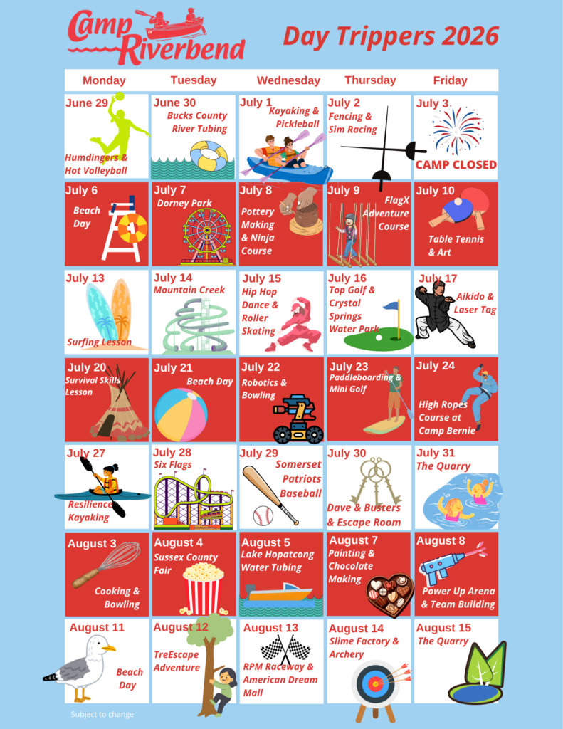 The group takes day trips every day, traveling on a regular camp bus. For summer 2026, we’re planning trips to the Jersey shore, amusement parks, drone racing, water tubing, challenge courses, boating and river rafting, making art, martial arts, cooking, and many more fun activities.